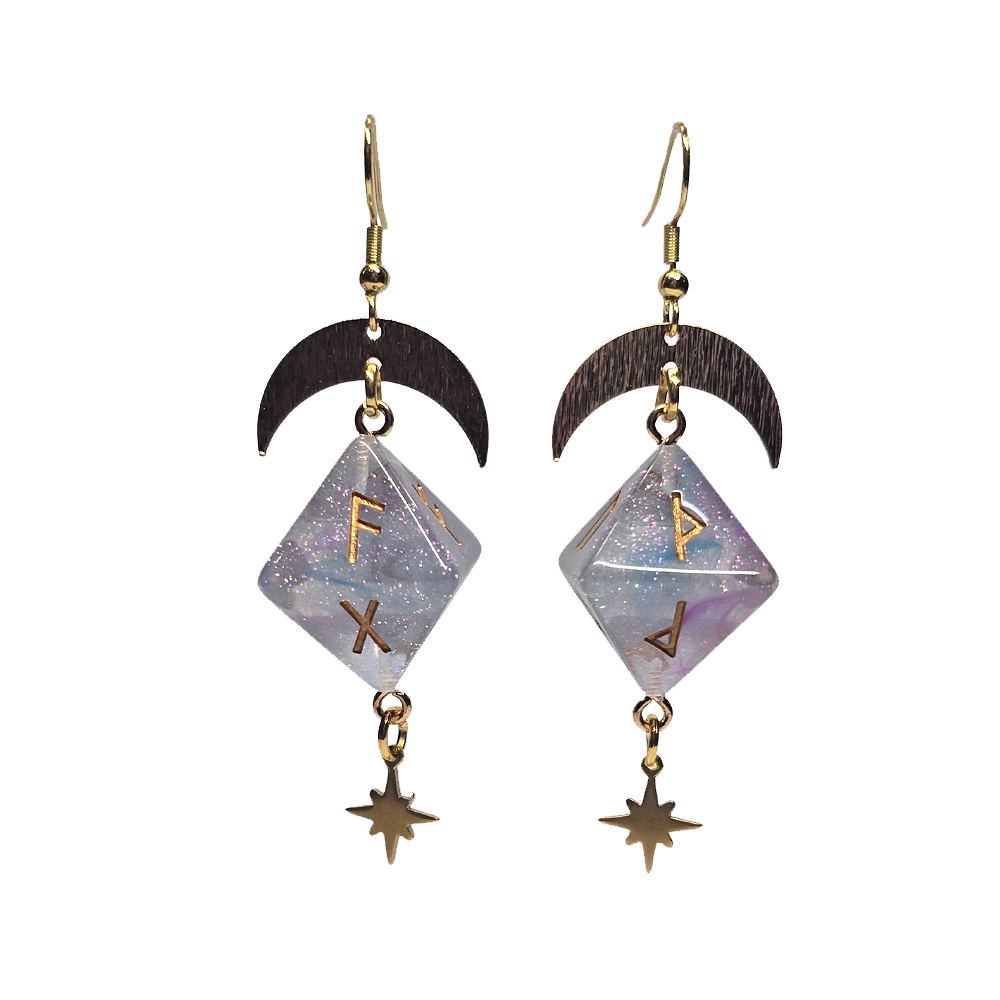 Infuse your look with cosmic charm using the Mystical Rune Earrings. Crafted from sparkling resin, these beautiful earrings showcase Nordic runes alongside shimmering stars and crescent moons.
