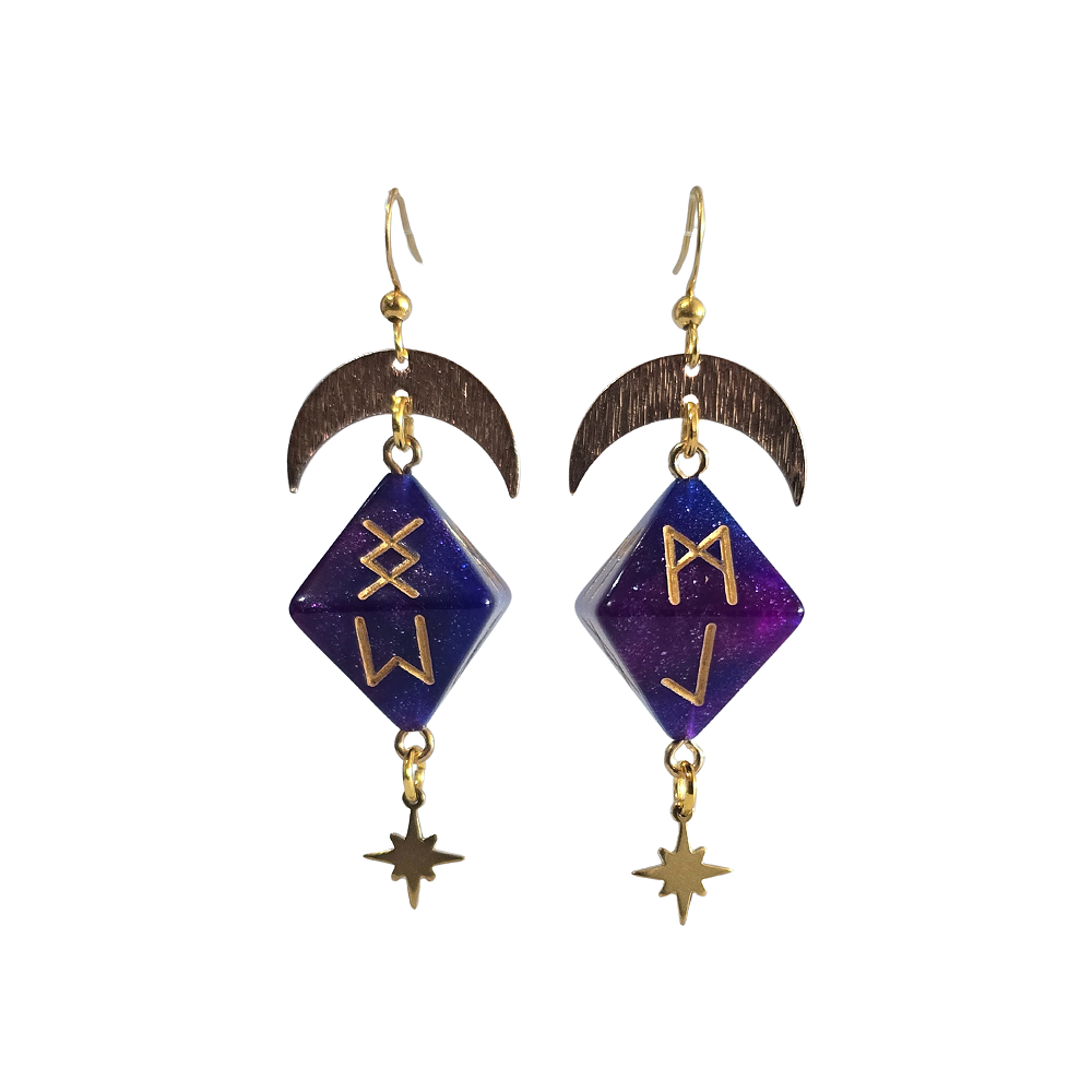 Infuse your look with cosmic charm using the Mystical Rune Earrings. Crafted from sparkling resin, these beautiful earrings showcase Nordic runes alongside shimmering stars and crescent moons.